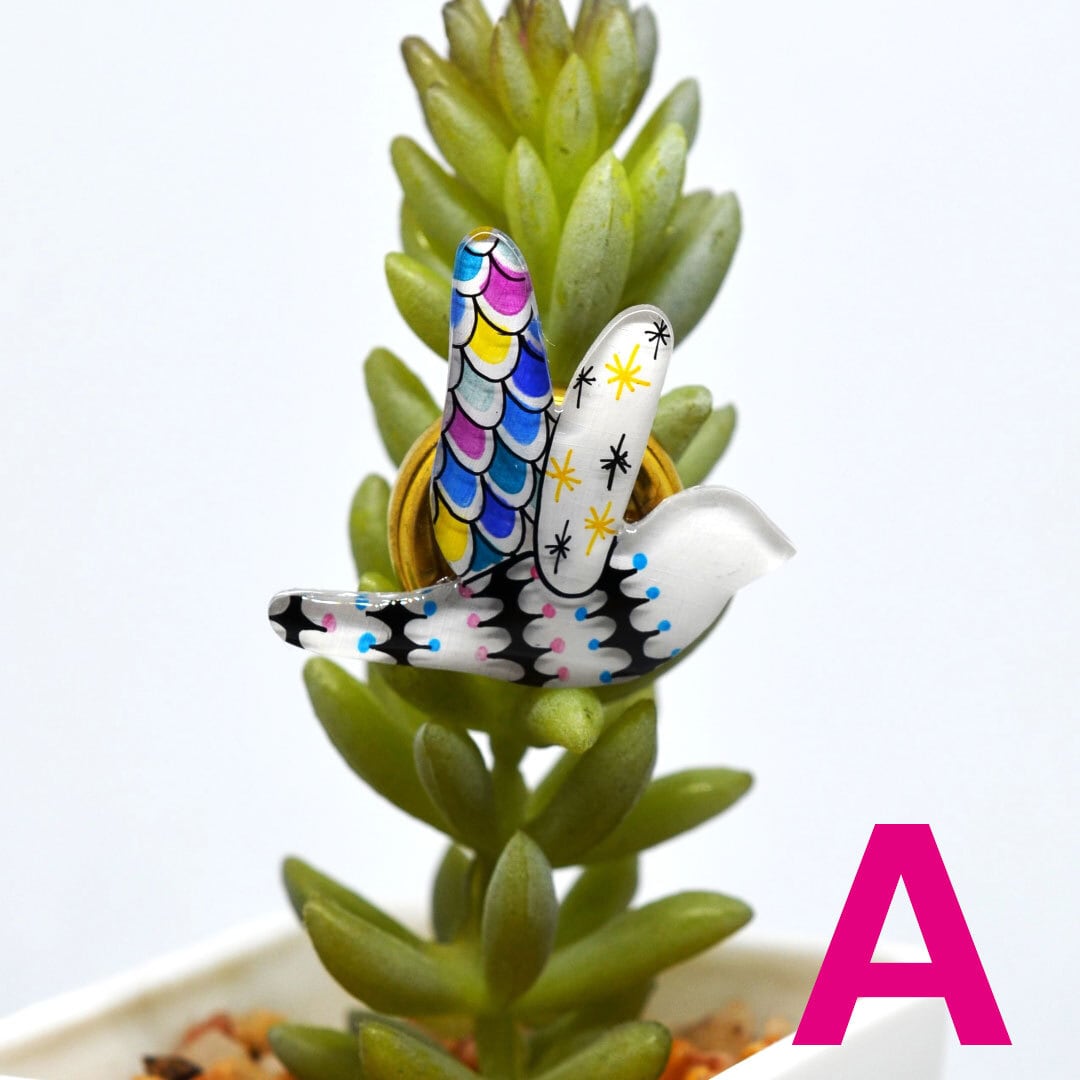 ひとつひとつベースのプラ板に手描きで模様を描き色鉛筆で着色、塗り絵をする様に作品を作っています。
